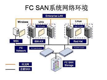 FC SAN(Storage Are Network)光纤存储局域网络是允许存储设备和服务器之间建立直接的FC光纤连接,通过这种连接实现只受光纤线路长度限制的集中式存储。SAN可以被看作是存储总线概念和DAS(Direct Attached Storage)直连存储的一个扩展,通过FC光纤通道,前端的服务器象使用本地硬盘一样使用后端的存储。