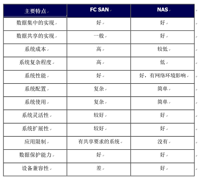 从上表对比中,我们可以看到,FC SAN比NAS复杂,昂贵。NAS和SAN有完全一样的性能,但总体成本更低,更容易使用和管理。更重要的是,NAS比SAN更容易在数据共享的实现上表现优异,这在保险行业办公平台上,尤其重要。