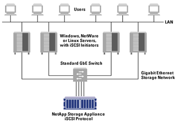 这一技术是将现有的存储协议,SCSI,直接集成在IP协议中,以使存储和网络可以无缝的融合。当然,这并不是指,可以在企业IT系统中,把存储网络和传统的LAN,物理上合并成一个网络。而是指在传统的存储结构中,以IP协议替代光纤通道协议,来构建结构上与LAN隔离,而技术上与LAN一致的新型系统——iSCSI存储。这种iSCSI存储中,用户不仅可以在保证性能的同时,有效的降低成本,而且,以往用户在TCP/IP以太网络上获得的维护经验、技巧都可以直接应用在iSCSI存储网络上。俯拾皆是的IP网络工具,使iSCSI网络维护轻松而方便。同样,维护人员的培训工作,也不会像光纤技术培训那样庞杂而冗长。图 3:iSCSI 的网络拓扑图