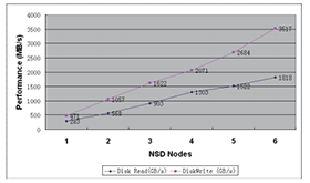 1.动态不中断业务的扩展性能和存储容量:NetApp E-7900采用模块化设计,其自身具有良好的系统扩展性,同时系统内部采用特制的高效XOR引擎(存储的CPU)芯片,实现RAID5、RAID6运算的硬件处理,因此,具有良好的系统输出性能。配合IBM通用的并行化大型文件系统GPFS,使系统具有优异的性能线型扩展。在现场测试中,我们的这一点给客户留下深刻的印象。下图是实 际测试的NAS头与系统输出性能的结果数据: